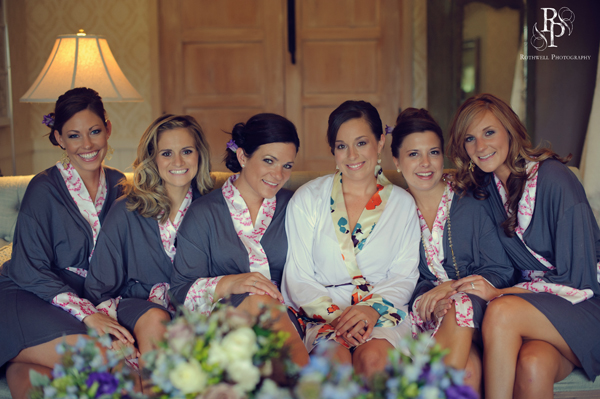 “Jonny & I got married on September 24, 2011, at Pippin Hill, a beautiful vineyard in the Blue Ridge mountains of Virginia. My bridesmaids and I enjoyed my last night as a single girl with a sleepover at the Boar’s Head Inn. When everyone woke up the morning of the big day, I asked the girls to climb into one of the bigger beds, still in their PJs and bleary eyed from our celebration the night before. I brought them each a different colored gift box. I had written personalized letters to each of my maids, and after reading, they unwrapped their matching Doie Lounge robes. They couldn’t have been more excited! No one could resist putting on their robe immediately – in fact, we traveled from the Inn to the venue in just our robes! They made for a great outfit to relax in while getting our hair and makeup done – as well as enjoying some pre-ceremony bubbly! – and made it so easy for them to transition into their bridesmaid dresses – and me into my gown.”
